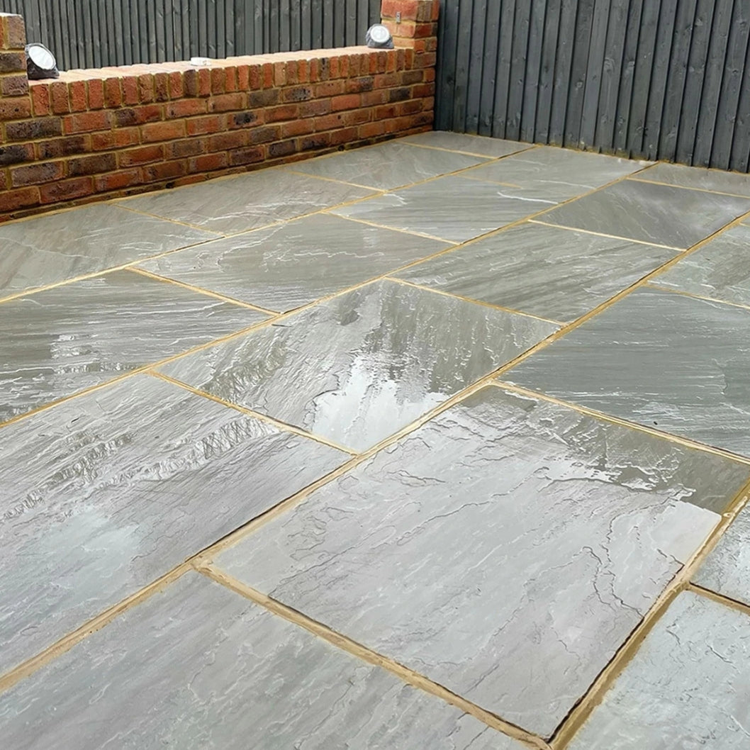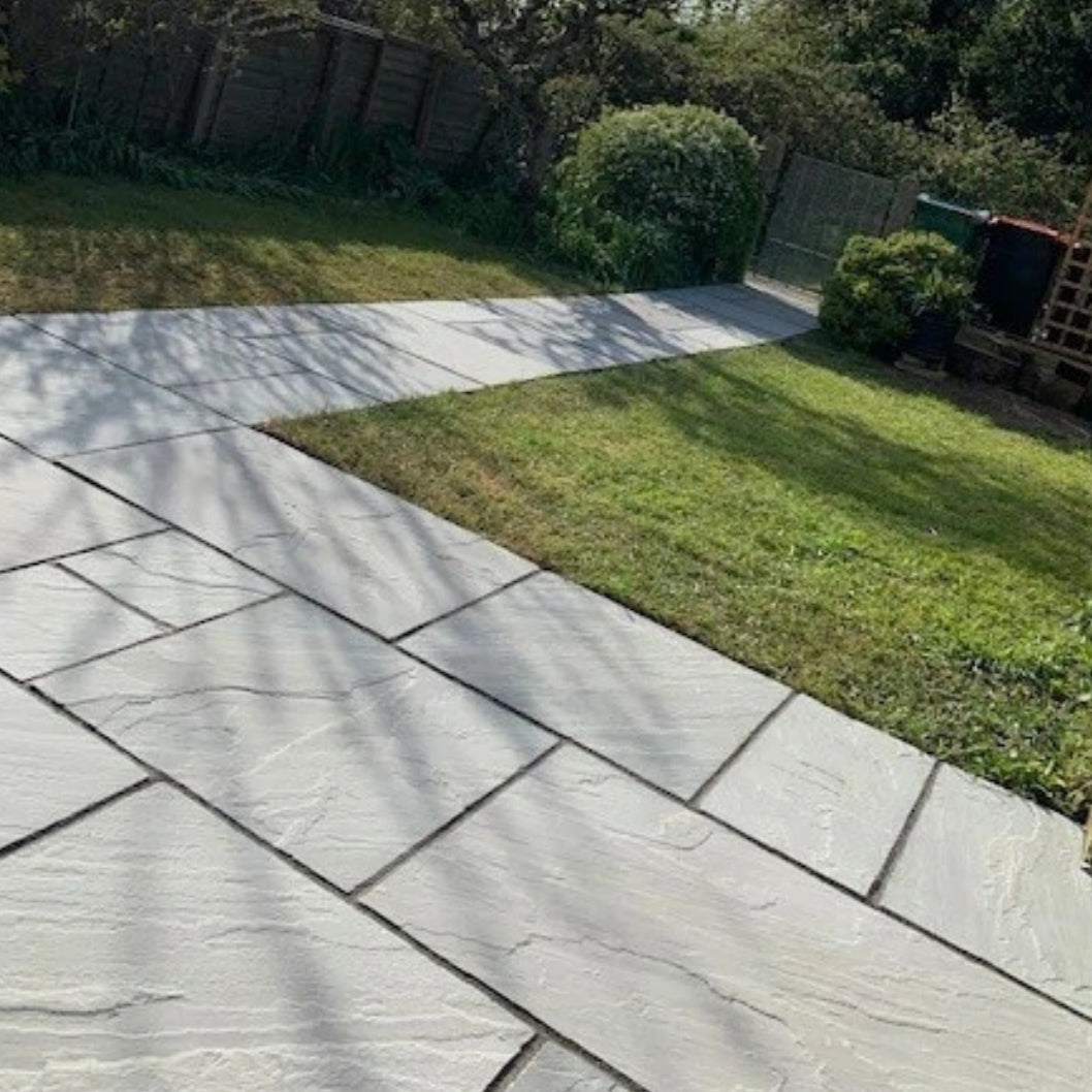 Each paving slab is **calibrated to a consistent 22mm thickness** for easy installation and reliable performance. The stone is **riven and tumbled**, meaning its surface retains a natural texture while being gently smoothed to remove sharpness, resulting in excellent **grip underfoot**. Ethically sourced and **CE approved**, Aravalli Grey Sandstone is highly durable, frost-resistant, and designed to thrive in the **British climate** — ensuring your patio remains stunning year after year.