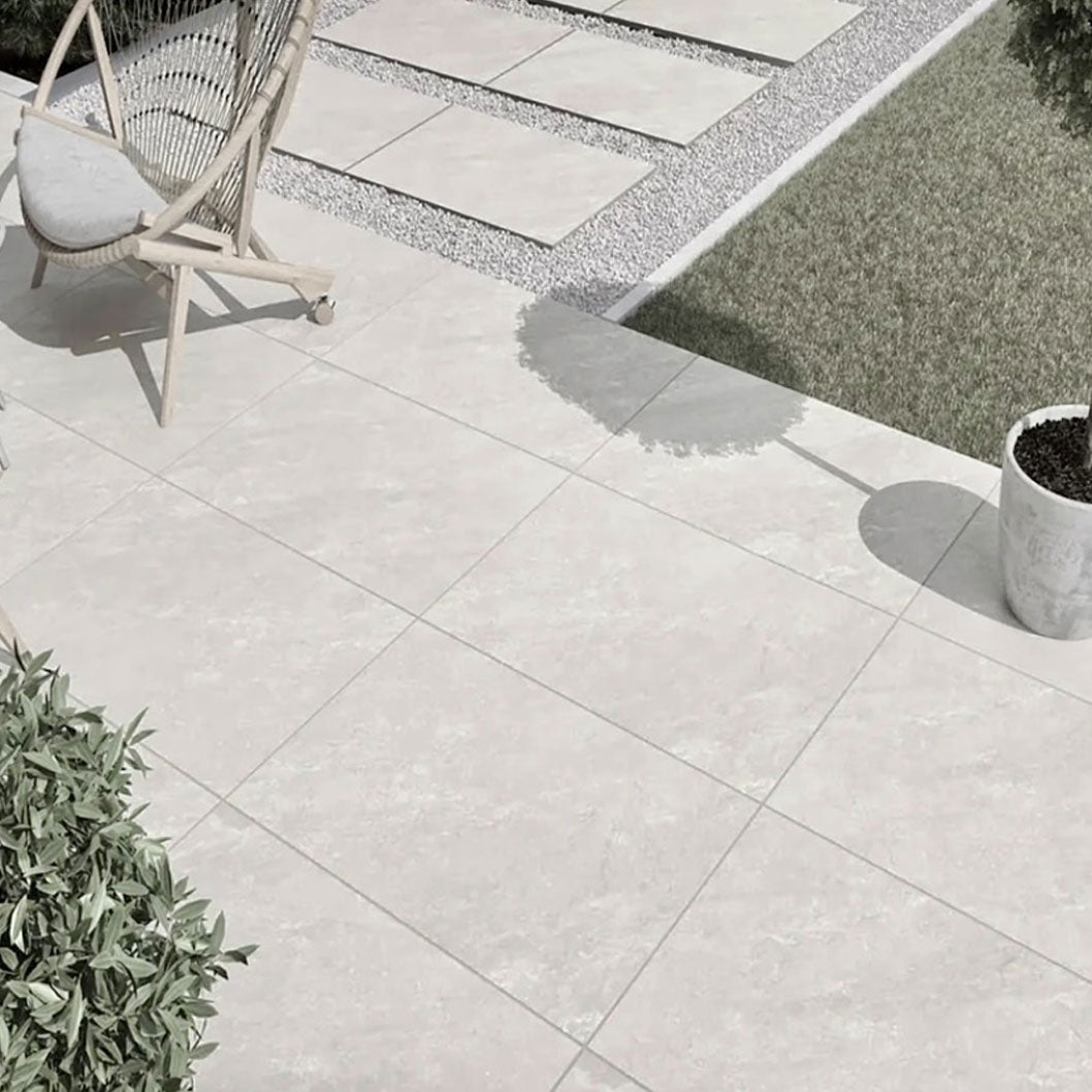 Cotton White porcelain paving slabs offer a clean, bright finish that helps open up outdoor spaces and create a fresh, modern look. Their light tone works particularly well in patios, seating areas, and contemporary garden designs.