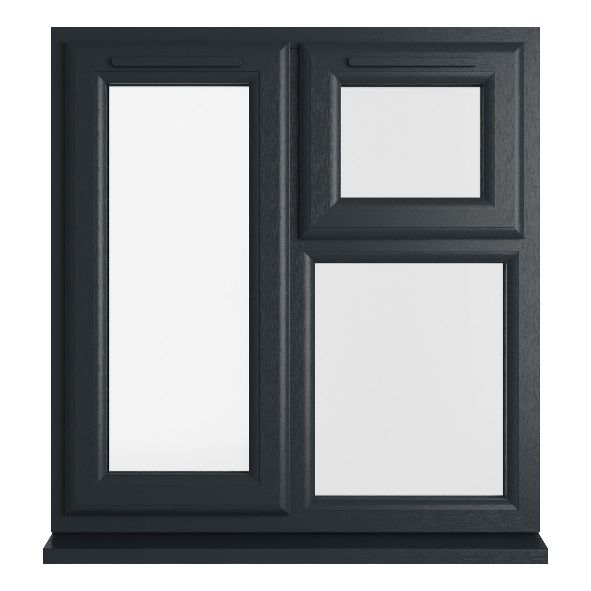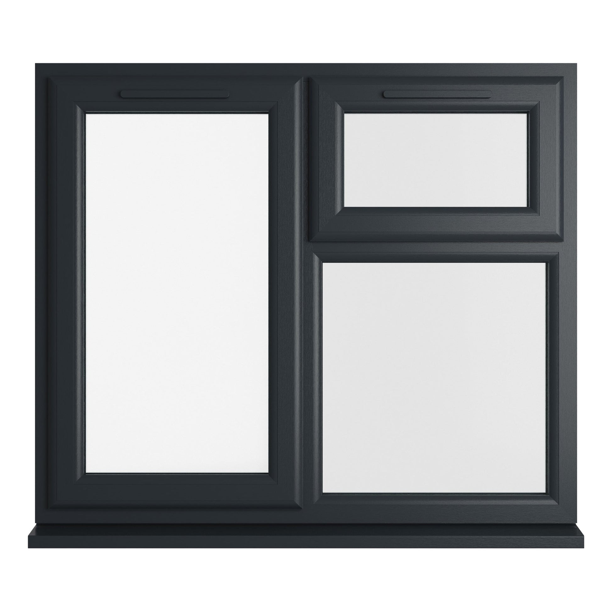The Crystal uPVC Window Grey 7016 external White Internal A Rated Left Hand Side Hung Next to a Top Opener Over a Fixed Light Clear Glazing is double glazed using a high energy efficient glazing unit. Featuring espag locking, trickle ventilation and comes with handle, PVC cill and glazing packers to glaze the unit. It measures with the overall height including the cill. All product handings are viewed from the outside.