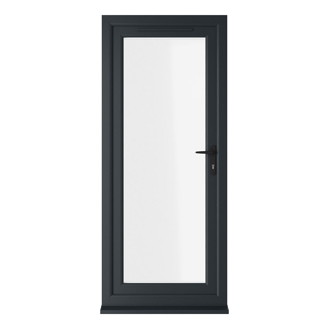 The Crystal UPVC Grey 7016 External White Int Clear Glazing Single Door Full Glass Double Glazed Left Hand Open is a well-engineered solution for stylish, secure, and thermally efficient entryways. Overall U Value of 1.4 W/m2K. 28mm Low E toughened safety glazing unit including argon gas and Warm Edge spacer bar