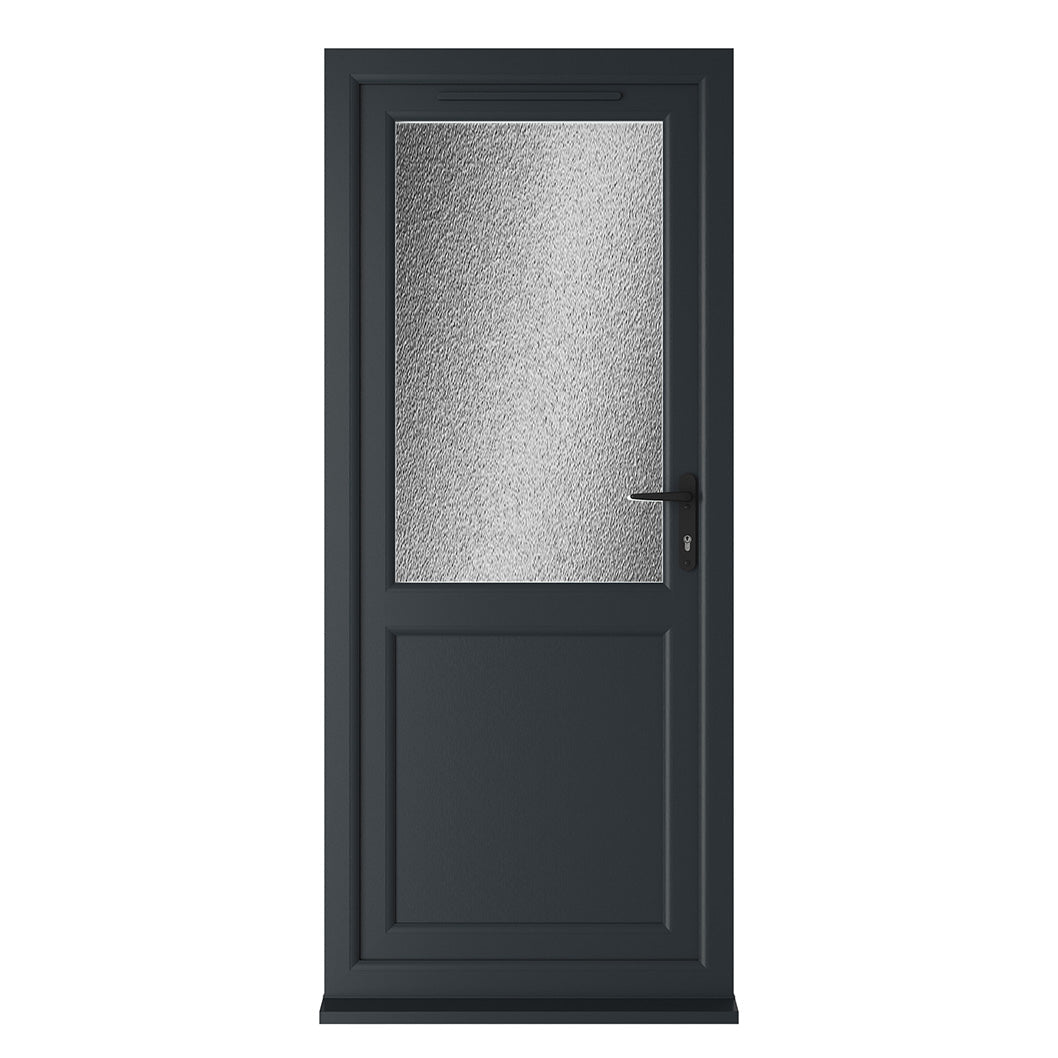 The Crystal UPVC Grey 7016 External White Int Obscure Glazing Single Door Half Panel Double Glazed Left Hand Open is a well-engineered solution for stylish, secure, and thermally efficient entryways. Overall U Value of 1.4 W/m2K. 28mm Low E toughened safety glazing unit including argon gas and Warm Edge spacer bar