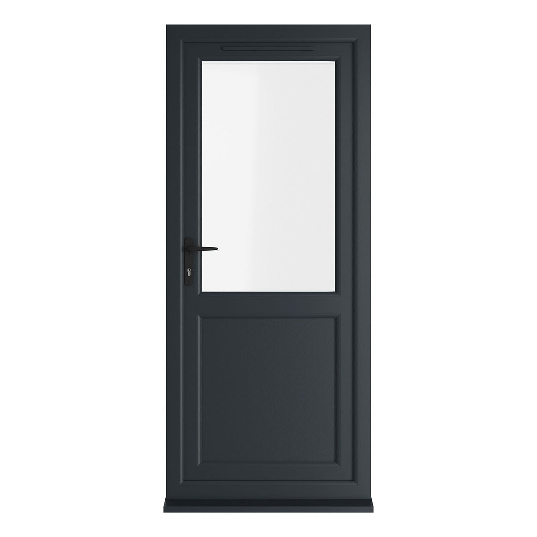 The Crystal uPVC Triple Glazed Single Door Half Glass Half panel Right hand Grey/White Clear Glass is triple glazed using a high energy efficient toughened safety unit. Featuring high security hook locks, trickle ventilation and comes with handle, PVC cill and glazing packers to glaze the unit. It measures with the overall height including the cill. All product handings are viewed from the outside.