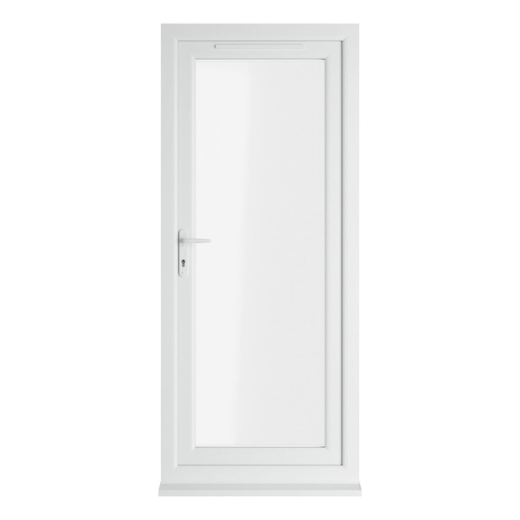 The Crystal uPVC Triple Glazed Single Door Full Glass Right hand White Clear Glass is triple glazed using a high energy efficient toughened safety unit. Featuring high security hook locks, trickle ventilation and comes with handle, PVC cill and glazing packers to glaze the unit. It measures with the overall height including the cill. All product handings are viewed from the outside.