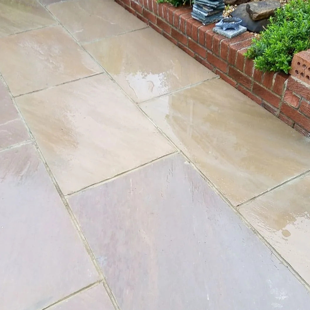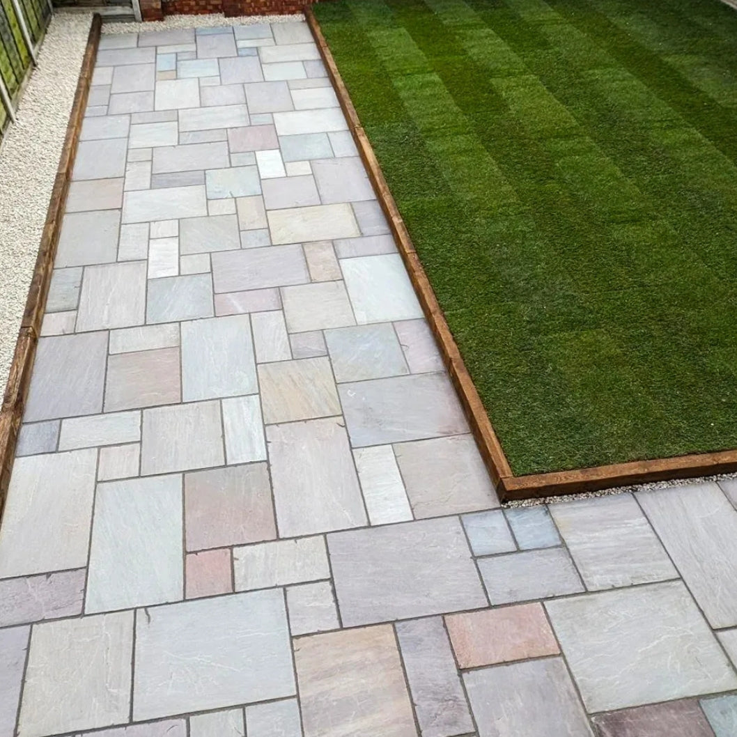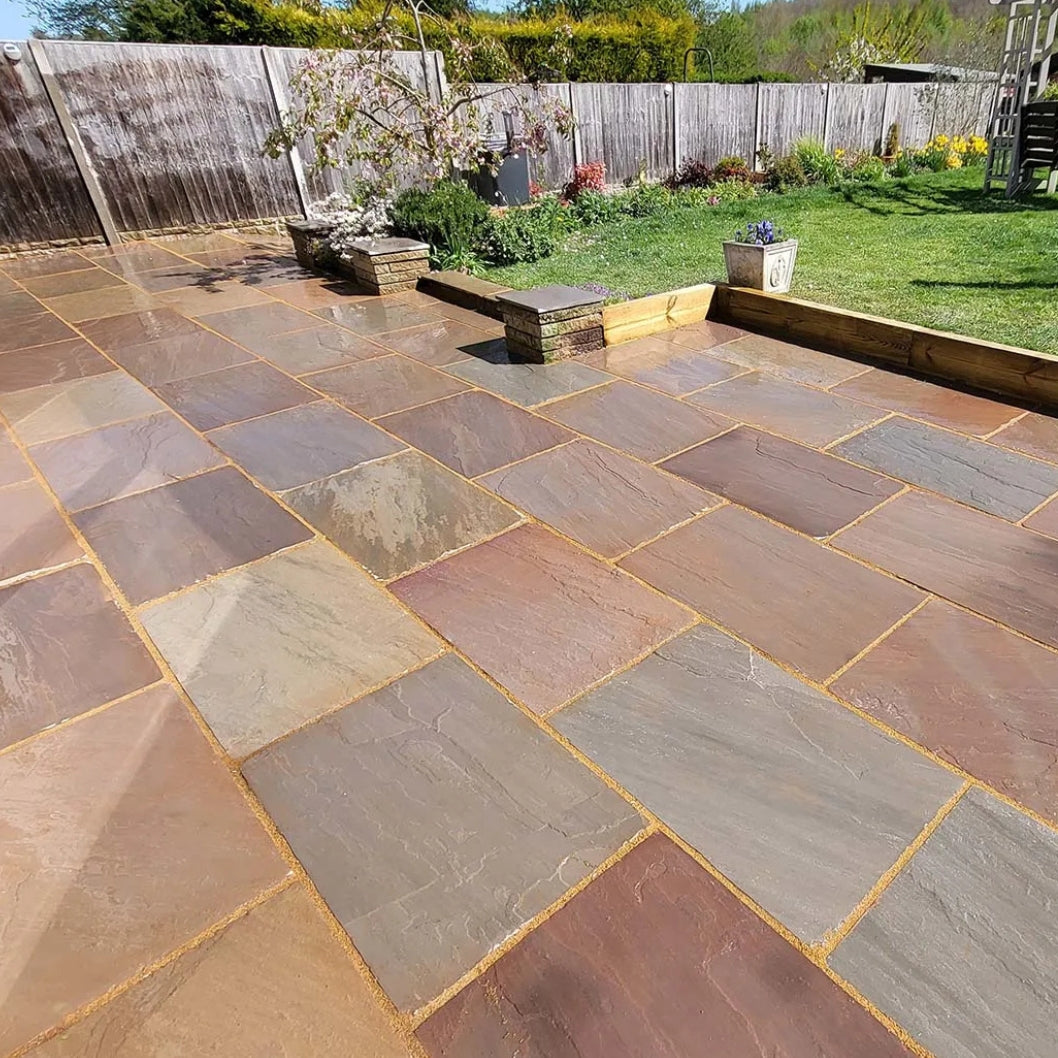 Create a stunning, natural-looking patio with our Imperial Green Indian Sandstone Paving Slabs. Known for their beautifully varied tones and authentic riven texture, these slabs bring warmth, charm, and timeless style to any outdoor space. Often referred to as Raj Green or Raj Blend Sandstone, this paving is loved for its organic character and the unique patterns formed through thousands of years of natural stone development. Each slab features a beautifully naturally riven surface and hand-dressed edges, giving your patio a traditional, craftsman-finished look. The vibrant greens, soft greys, and warm earthy shades blend effortlessly into any garden design, while the colour variation ensures no two slabs are ever exactly the same. Whether wet or dry, the stone maintains a rich, eye-catching appearance that enhances the overall aesthetic of your outdoor areas. With a calibrated thickness of 22mm, this paving is strong, durable, and perfectly suited to the British climate. Its frost-resistant qualities and naturally grippy surface help it withstand harsh weather while remaining safe and low-maintenance year-round. As a CE-approved product, it meets high standards for quality and long-term performance, making it an ideal choice for traditional patios, garden paths, or timeless courtyard settings.