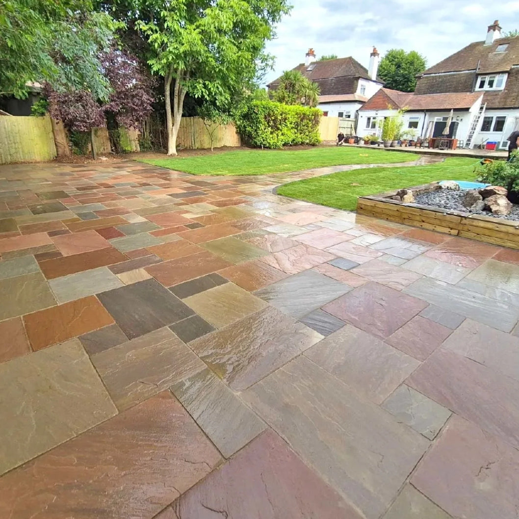 Each slab showcases a naturally riven surface, created by splitting the stone along its natural layers, which gives it an appealingly rustic feel. The hand-dressed edges add to the traditional effect, offering a finish that feels handcrafted and organic. Whether wet or dry, the stone displays rich and varied colour tones, making your patio look stunning in all weather conditions.