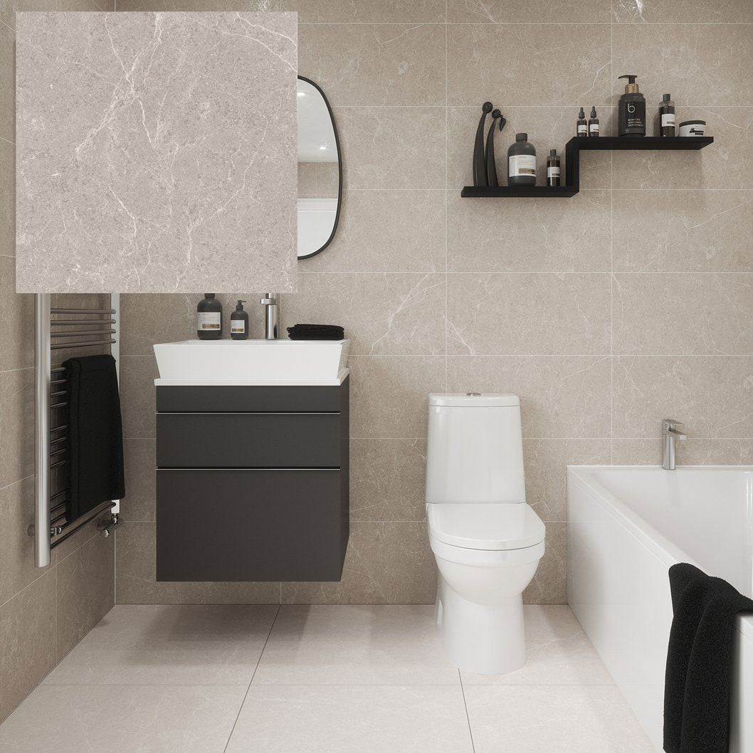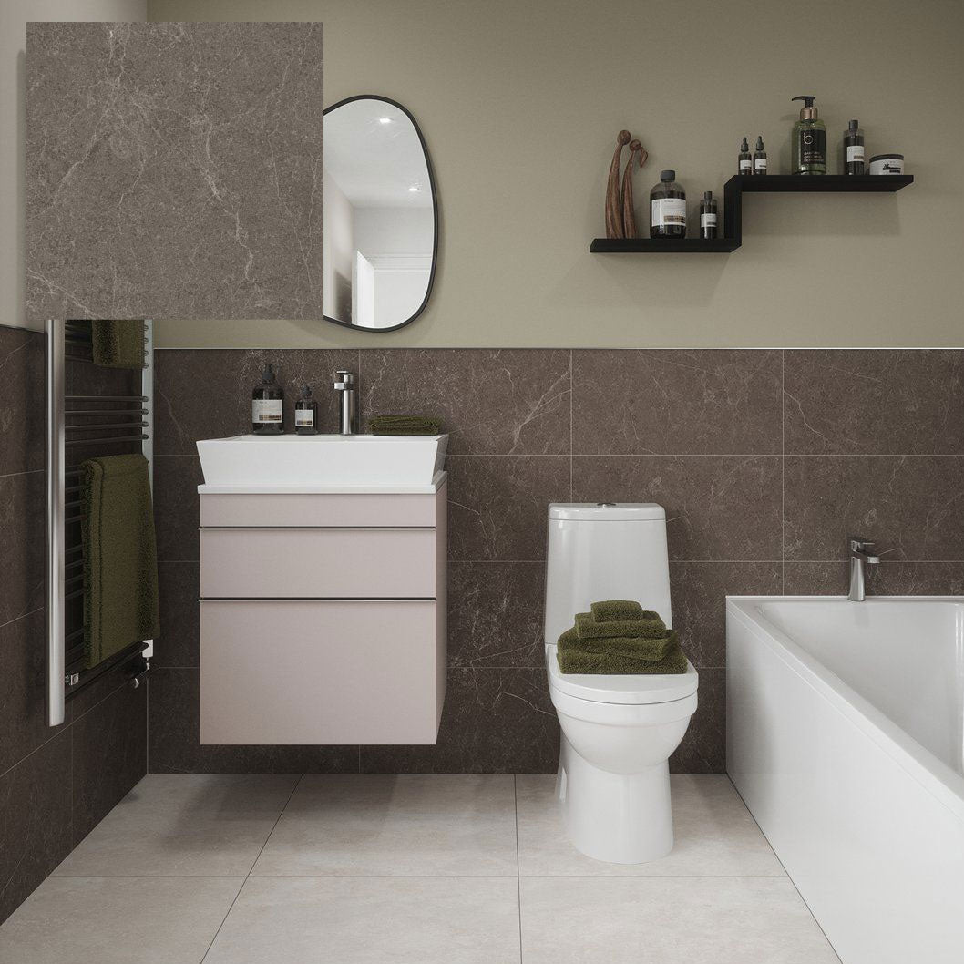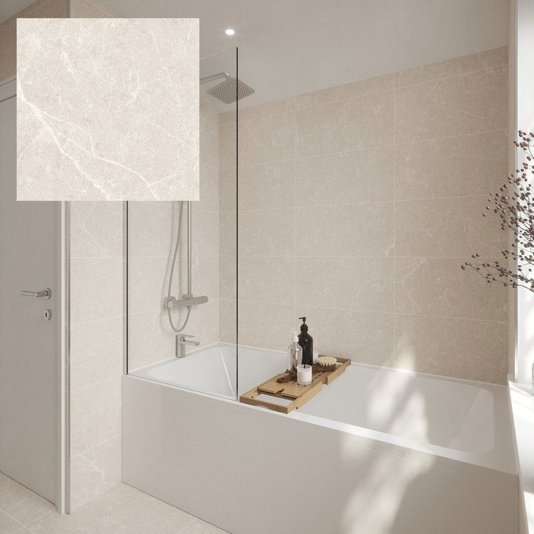 Available in large-format sizes—600x300mm for walls and 600x600mm for floors—Dakota tiles create a clean, seamless finish that feels luxurious yet understated. The design features delicate mineral vein detailing and a subtle shimmer achieved through glossy inkjet printing on a matt surface, giving the tiles an authentic stone-effect look.