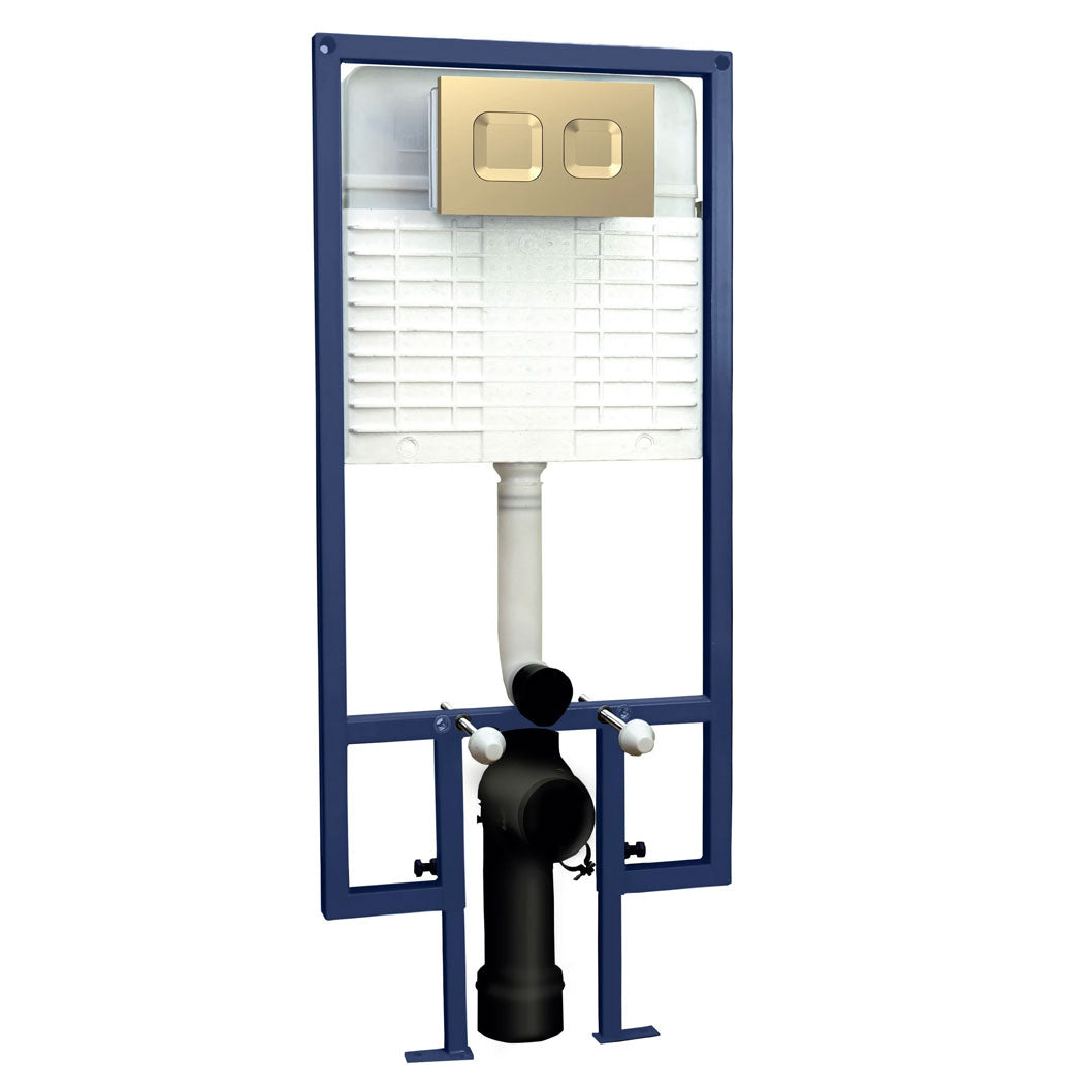 Contemporary concealed cistern with wall-hung frame. ABS rounded flush buttons with a luxury brushed brass finish. Water saving dual flush mechanism.1136x520x204mm
