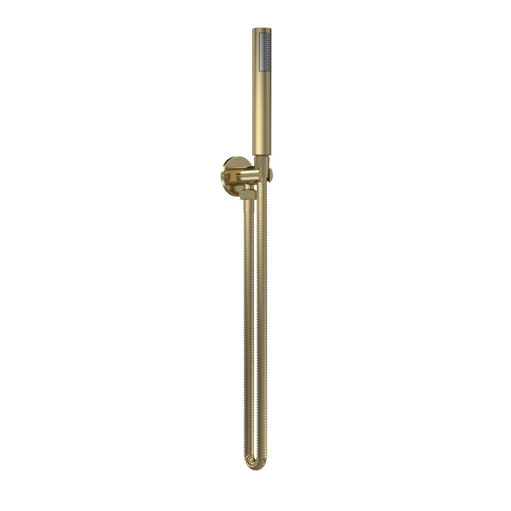 Round minimalist handset design with brushed brass finish. Rub-clean nozzles. 1/2" BSP connections. Brass parking bracket.1230x30x55mm