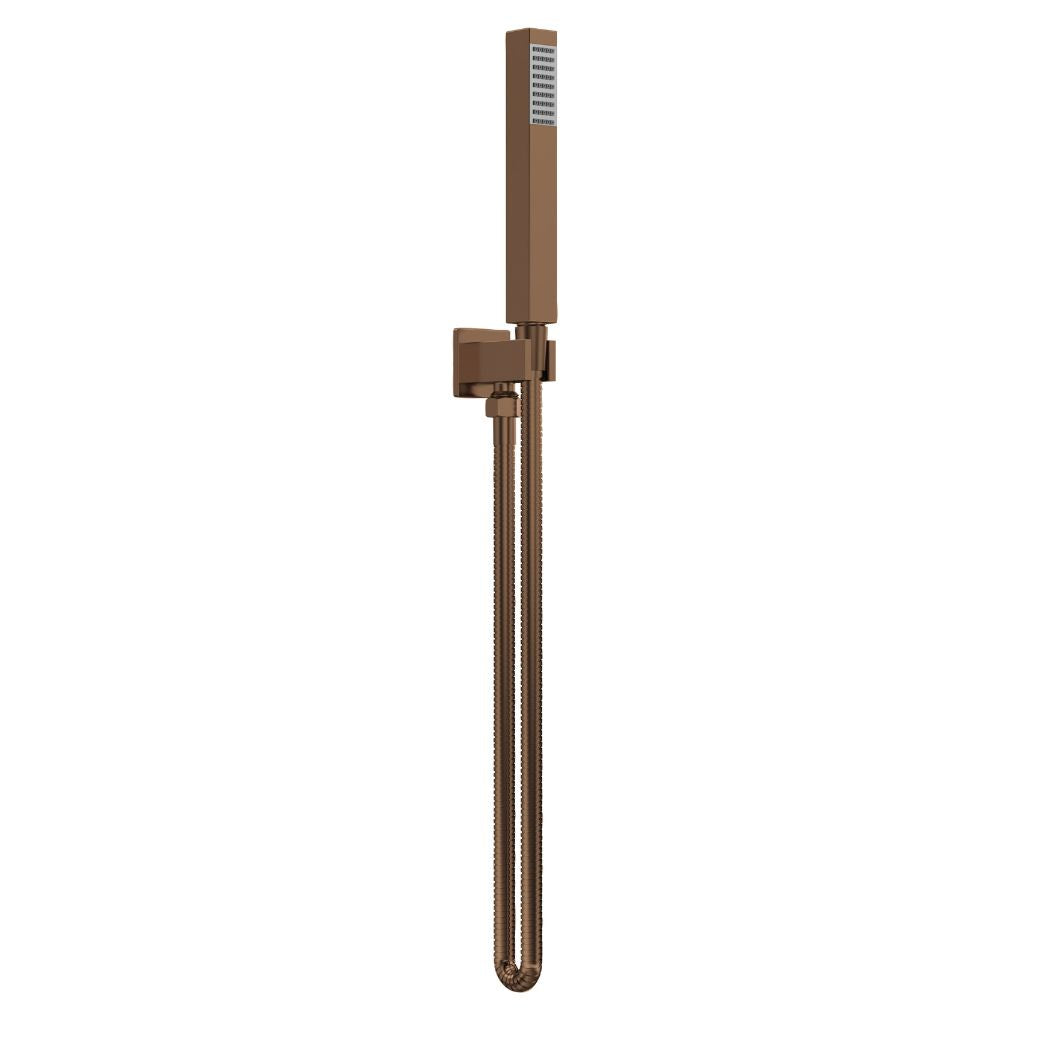 Round minimalist handset design. Rub-clean nozzles. 1/2" BSP connections. Brass parking bracket.1230x30x55mm