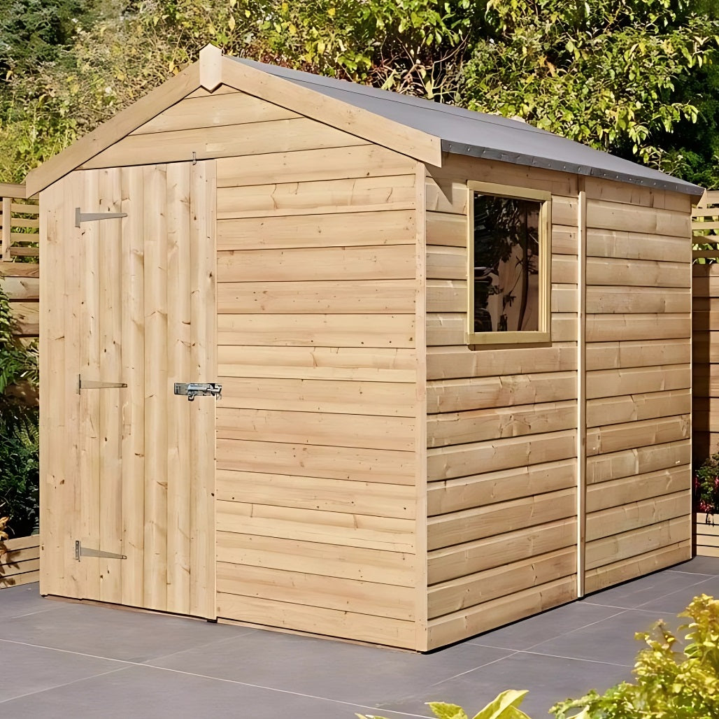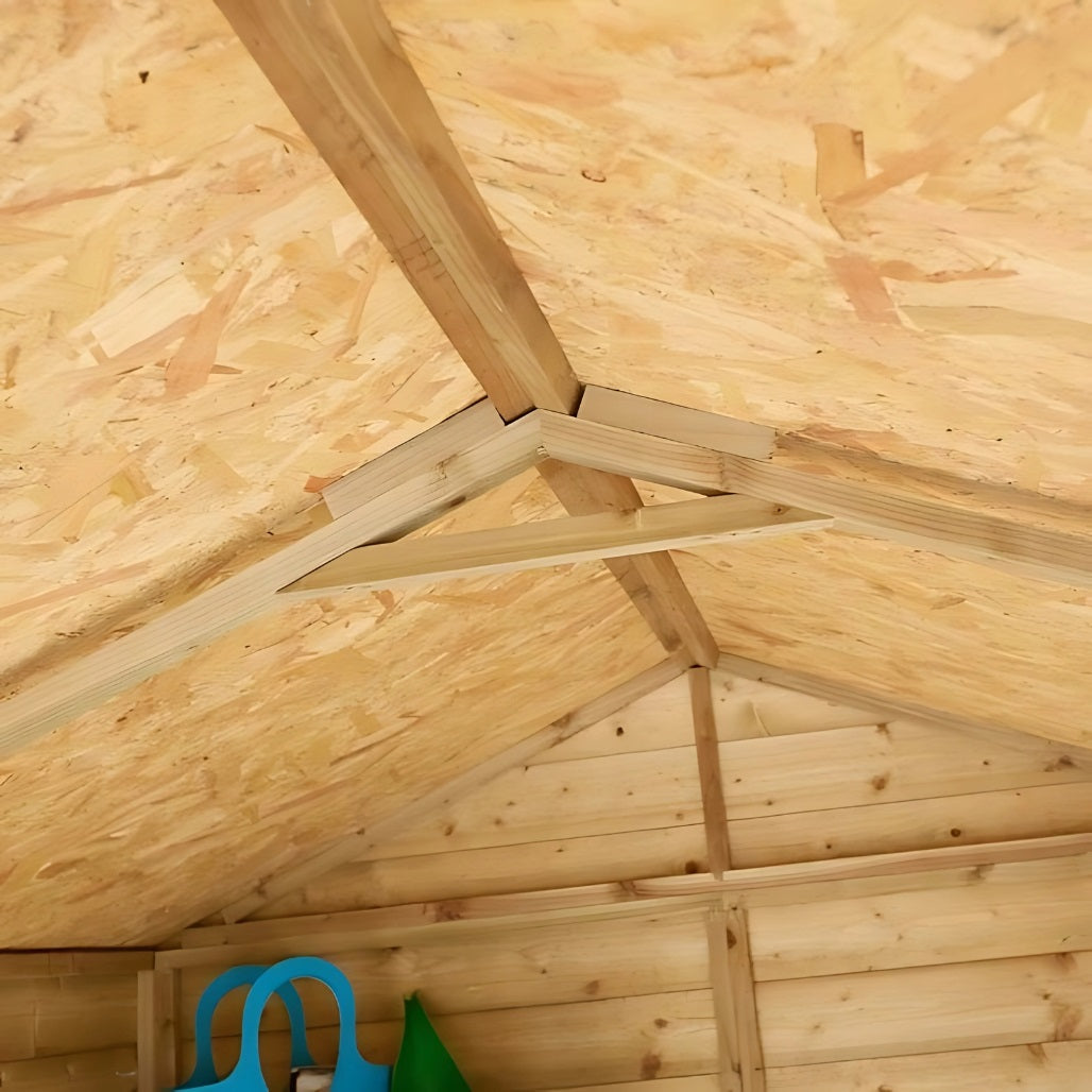 This shed is made from 12mm kiln-dried European tongue and groove shiplap cladding, known for its durability and clean finish. The interlocking design provides a strong barrier against wind and rain, keeping the contents dry and secure. The door is also T&G clad, reinforced with double 'Z' bracing to prevent warping and add rigidity.