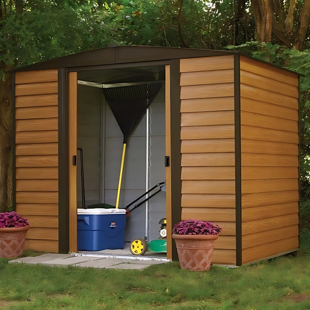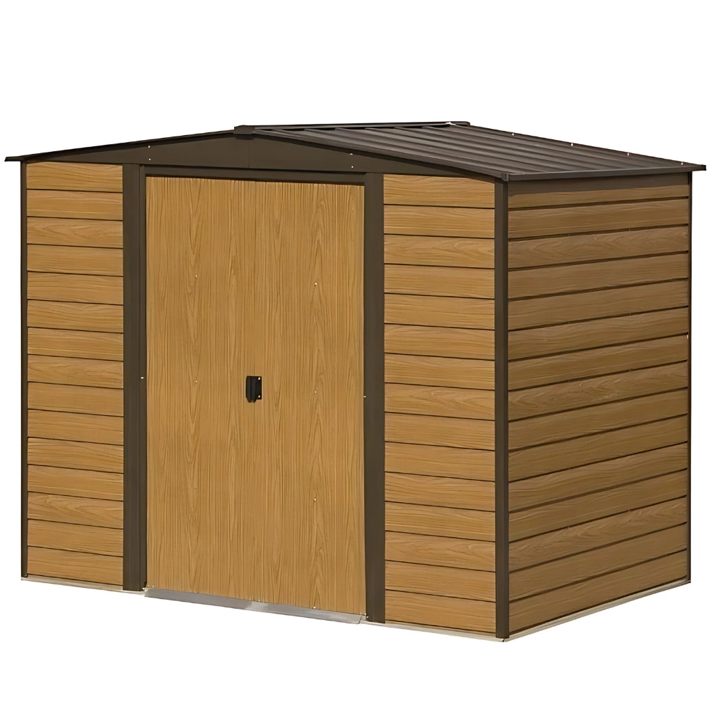 The Rowlinson Woodvale 8x6ft Metal Apex Shed combines the charming look of wood with the strength and durability of steel. Designed to enhance your garden while offering practical storage, it features realistic wood grain-effect shiplap-look panels that give it the appearance of a traditional timber shed—without the maintenance.