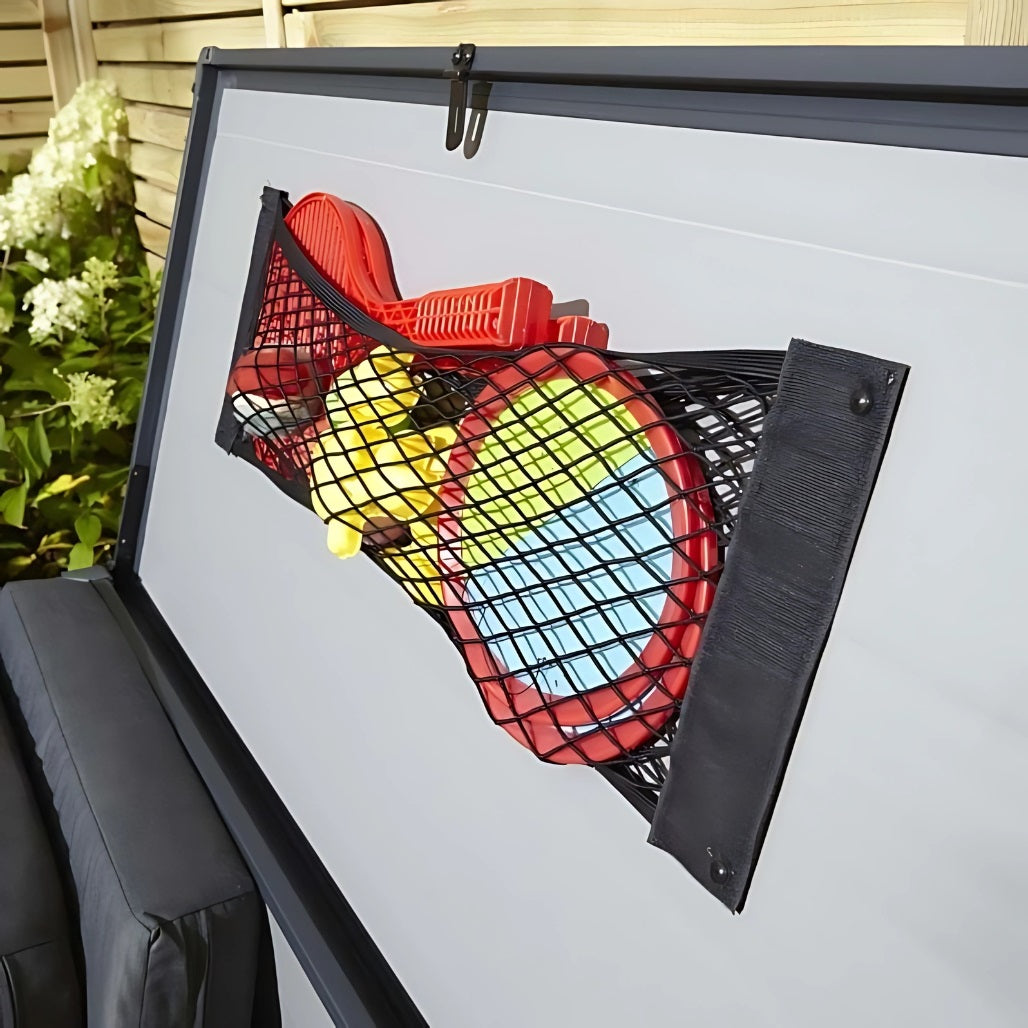Inside, you’ll find a handy net storage area—perfect for holding smaller items like garden gloves, cleaning cloths, or barbecue utensils. With a capacity of approximately 342 litres, there's more than enough room for multiple cushions or a variety of tools and garden equipment.