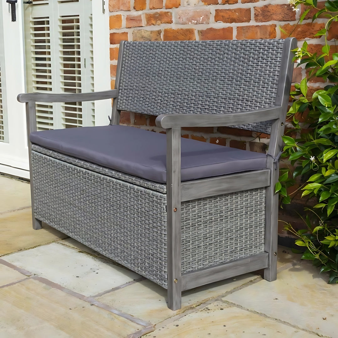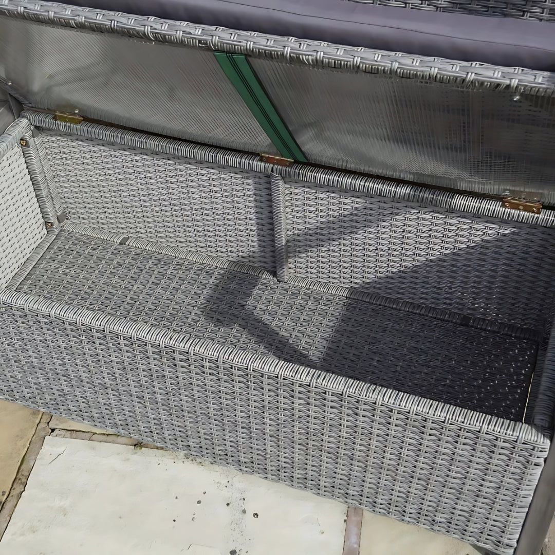 Lift the seat and you’ll find a spacious 150-litre storage compartment—perfect for tucking away cushions, garden tools, or children’s toys. The included seat pad in grey ensures added comfort for relaxing with a book or enjoying a drink outdoors. It comfortably seats up to two people, making it ideal for smaller patios, balconies, or as an accent piece in larger gardens.