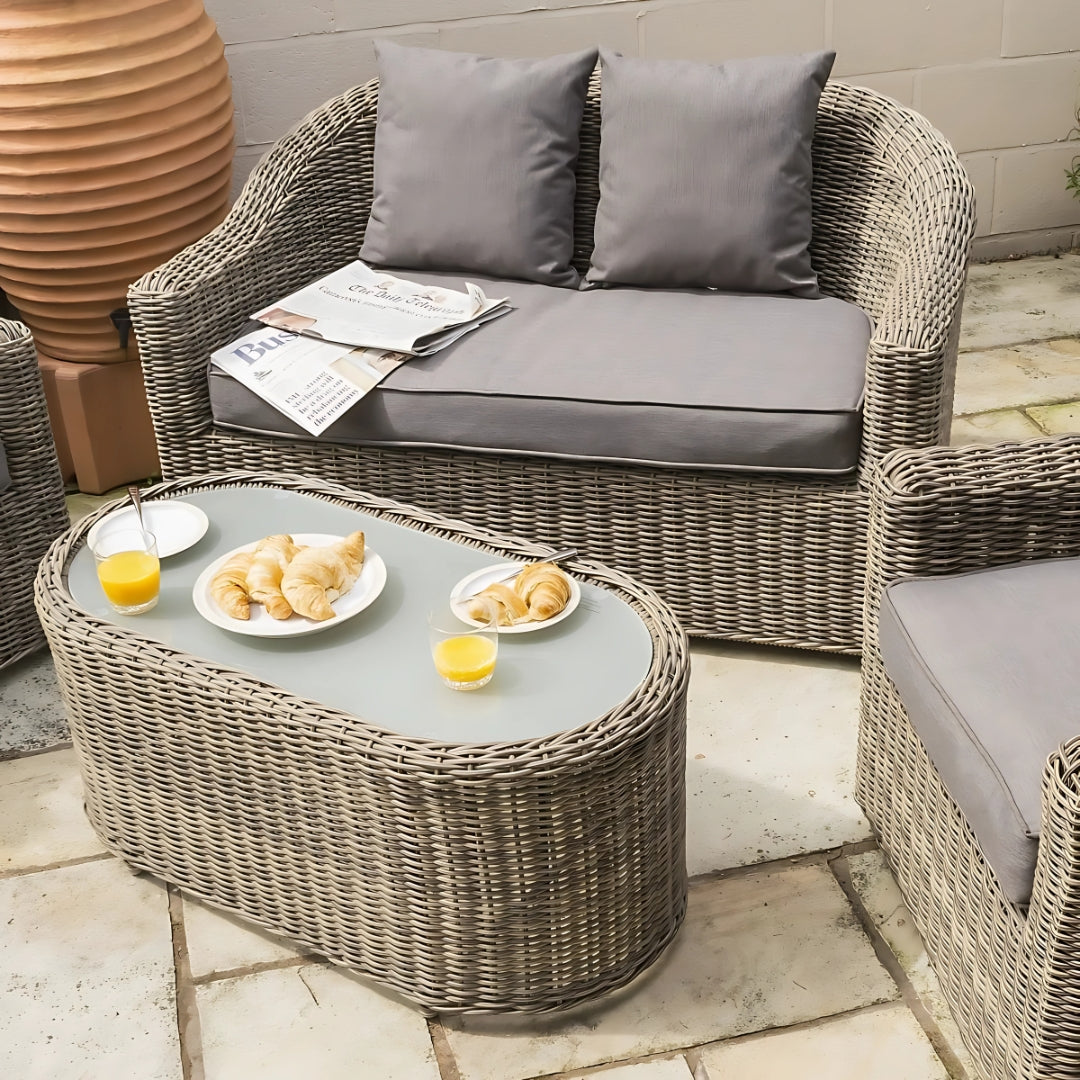This elegant set includes a two-seater sofa, two individual armchairs, and a frosted glass top coffee table, making it perfect for relaxing with a book, entertaining guests, or enjoying an evening drink outdoors. The weatherproof poly rattan weave is crafted around durable powder-coated aluminium frames, ensuring a sturdy yet lightweight construction that resists the elements.