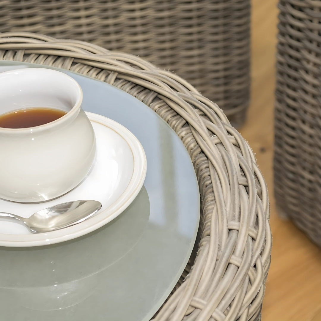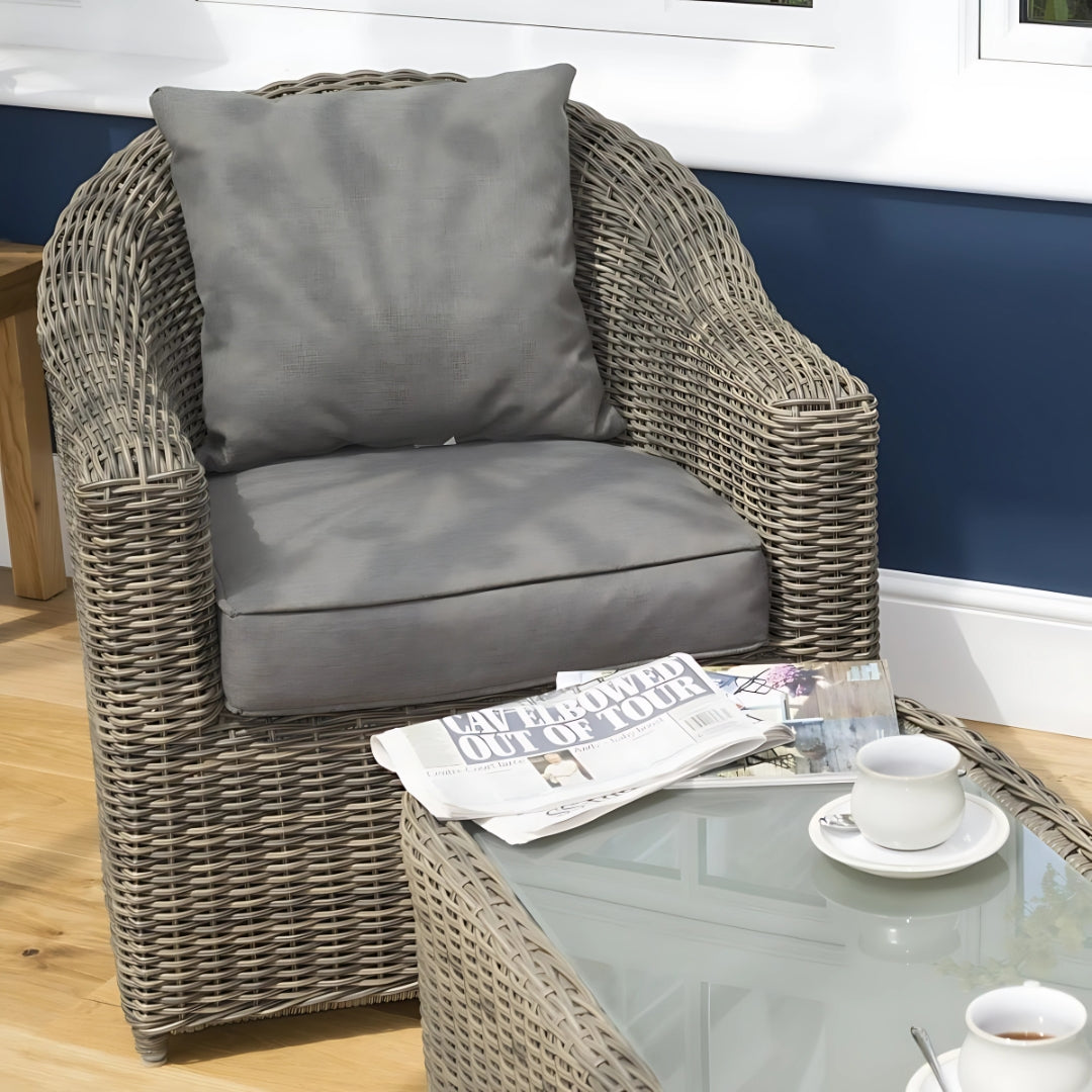 Each piece is finished with 6.5mm half-round wicker, complete with full round detailing, giving the set a premium appearance. Cushions and seat pads are included to enhance your comfort, with covers that complement both the natural and grey rattan colour options.