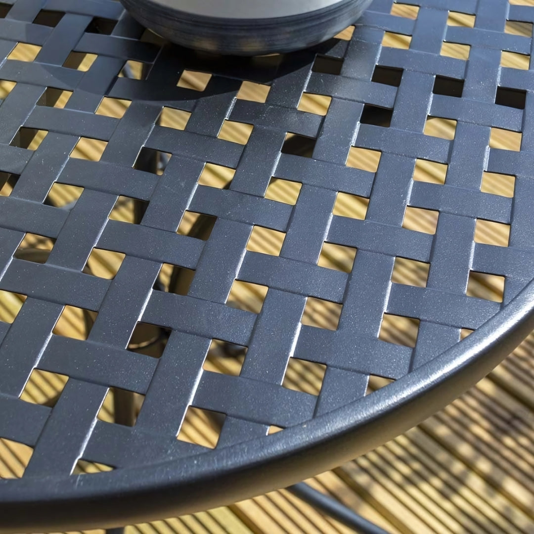 The Havana Bistro Set features a traditional pressed lattice pattern that adds a decorative flair to any outdoor space. The entire set is finished in a stylish matt black powder coating, which not only enhances its look but also provides added resistance to the elements. Its timeless aesthetic makes it a versatile choice that complements both classic and modern garden designs.