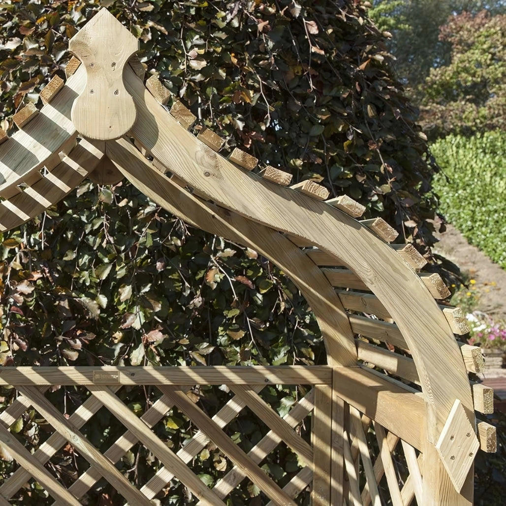 The arbour is supplied in a natural timber finish that complements any garden setting. It has been pressure treated to protect against rot, ensuring it remains durable and sturdy even in the unpredictable British weather.