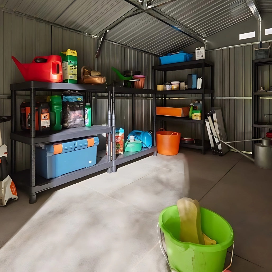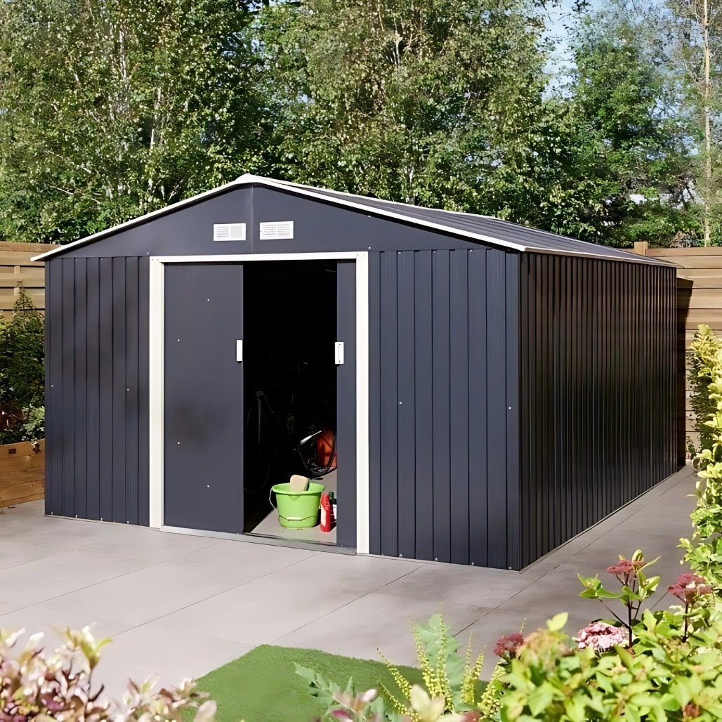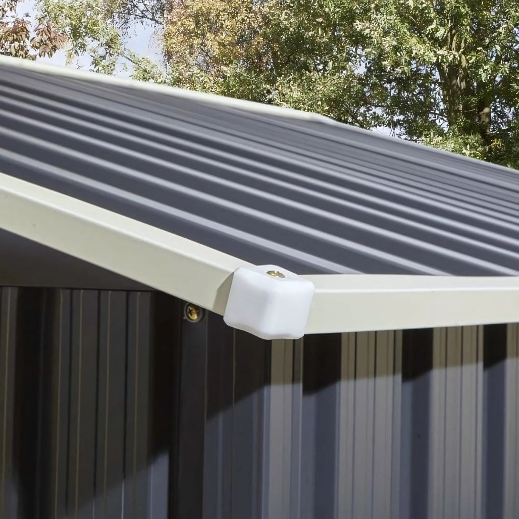 Built from electro-galvanised and painted steel, this shed is designed to last. Its fire- and rot-resistant materials offer long-term durability, and the dark grey finish with contrasting off-white trim adds a sleek, modern look that suits any outdoor setting.
