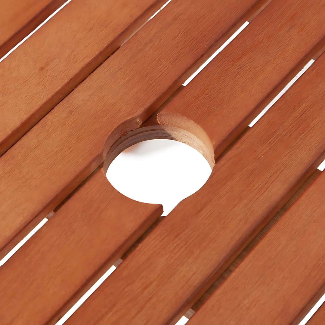 This set features a beautifully crafted 90cm square table, large enough to comfortably accommodate four people without taking up too much space. The tabletop showcases a classic slatted design with a solid border and soft, rounded edges for a refined finish. A 50mm parasol hole in the centre allows you to easily add shade on sunny days, making the set ideal for any weather.