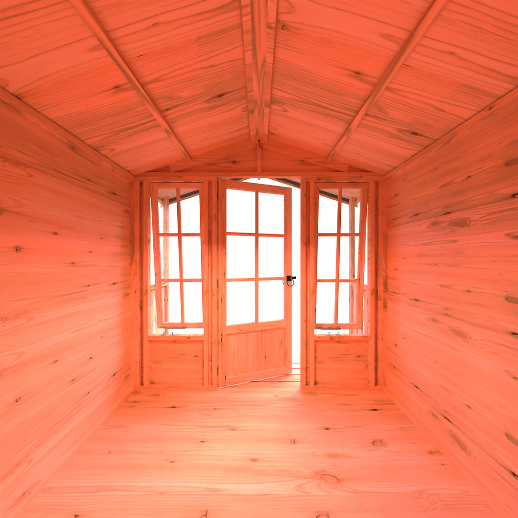 Constructed from high-quality tongue and groove cladding, the Chatsworth delivers both strength and style. The matching tongue and groove floor provides a sturdy base for your furniture, while the included OSB roof offers reliable weather protection. The charming joinery single door is flanked by matching wing lights, allowing plenty of natural light to flood in and brighten the interior.