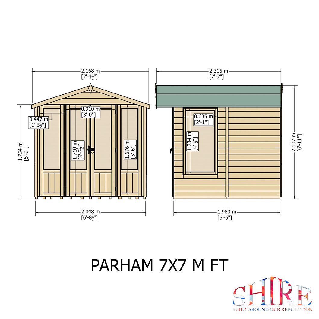 Shire Parham 7x7ft Double Door Tongue & Groove Wooden Summerhouse offers the perfect place to unwind and enjoy your garden in comfort. Whether you’re taking a shaded break from the summer sun, relaxing with a glass of wine, or simply soaking in the beauty of your outdoor space, the Parham makes it easy to enjoy those special moments.