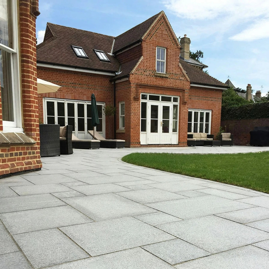 Granite is well-known for its robustness and longevity, making these paving slabs perfect for high-traffic areas such as patios, pathways, and pool surrounds. Their durability ensures your outdoor space will remain elegant and luxurious for years to come, even in challenging weather conditions. The lightly flamed surface adds both character and practical slip resistance, achieved by heating the stone until the crystals fracture naturally, creating a textured finish that is ideal for exterior paving.