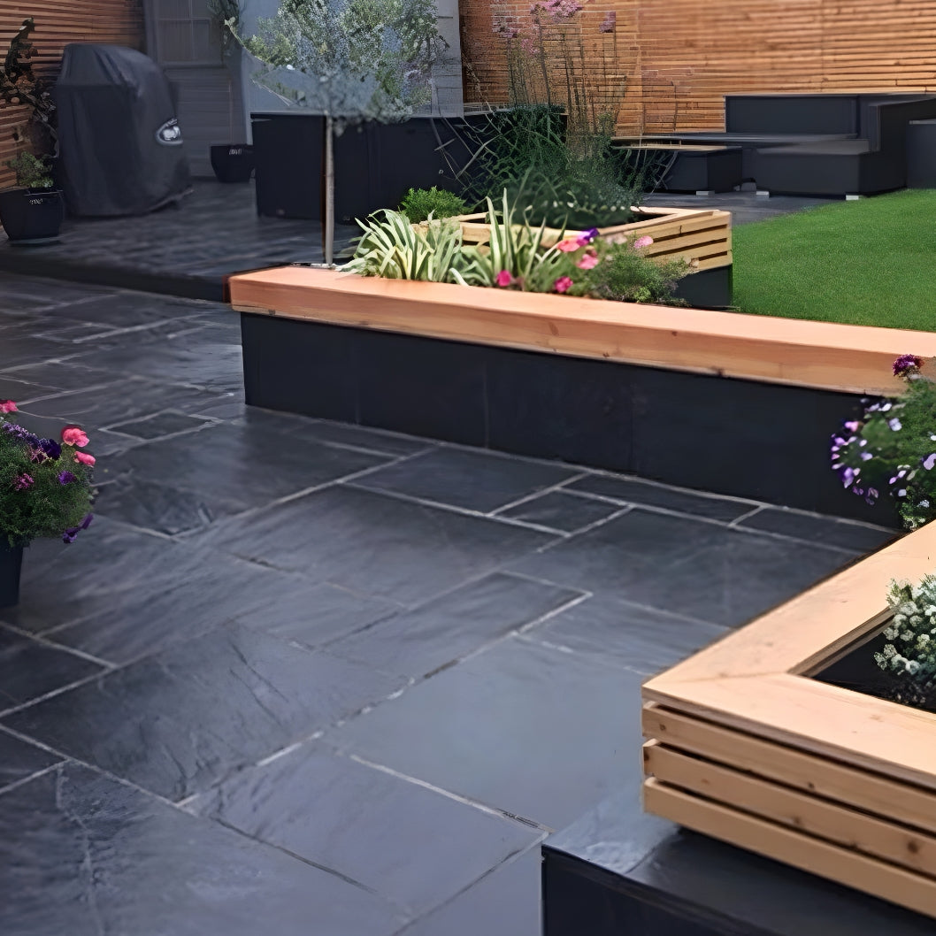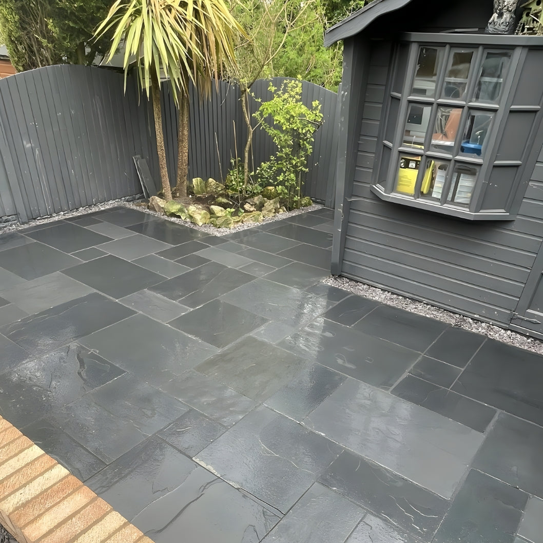 Slate naturally provides good slip resistance thanks to its riven texture. While no outdoor stone can be completely slip-proof, Steel Blue Slate is generally safe underfoot. As always, take normal care when walking on wet surfaces.