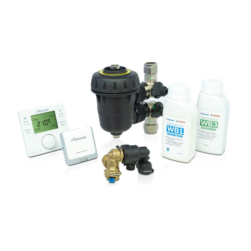 The Worcester Greenstar Comfort+ II RF System Pack is a complete, great-value solution designed to simplify boiler installation, enhance system protection and ensure long-term efficiency. Worcester Bosch Care Packs are created to help homeowners and installers meet key regulations — including Boiler Plus, BS7593, and Building Regulation Part L — while also extending the lifespan of the heating system.